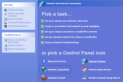 2. Kemudian akan muncul window Control Panel. Jika dalam keadaan Category View, klik Network and Internet Connection - kemudian pilih Network Connections. Namun jika dalam keadaan Classic View bisa langsung memilih Network Connections.